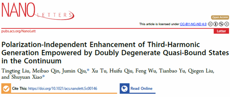 本網訊(信息工程學院)近日,我校信息工程學院成像與視覺表示研究團隊在非線性光學領域取得重要研究進展。團隊提出基于雙重簡并準連續域束縛態(Quasi-Bound States in the Continuum, Quasi-BICs)的硅基超表面設計,實現了偏振無關的三次諧波(Third-Harmonic Generation, THG)高效增強。相關成果以“Polarization-Independent Enhancement of Third-Harmonic Generation Empowered by Doubly Degenerate Quasi-Bound States in the Continuum”為題,發表于光學與納米科技交叉領域國際期刊Nano Letters。