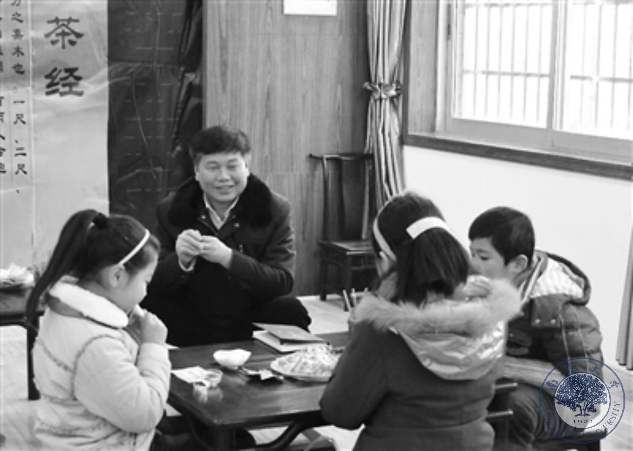 在學(xué)校茶藝教室里,余衛(wèi)跟孩子們談心。 李維 攝