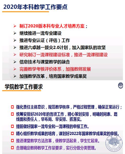 2020年本科教學(xué)工作的聚焦點(diǎn)是教師與課程,目標(biāo)是打造一批南昌大學(xué)的名師與金課。工作重點(diǎn)是制訂推行2020版本科專業(yè)人才培養(yǎng)方案,繼續(xù)推進(jìn)一流專業(yè)建設(shè)、專業(yè)認(rèn)證(評估)、六卓越一拔尖2.0計(jì)劃,研究制訂一流課程建設(shè)標(biāo)準(zhǔn),加強(qiáng)信息技術(shù)與課堂教學(xué)融合,完善教學(xué)考核評價(jià)體系,加強(qiáng)教學(xué)改革培育國家教學(xué)成果獎(jiǎng)。
